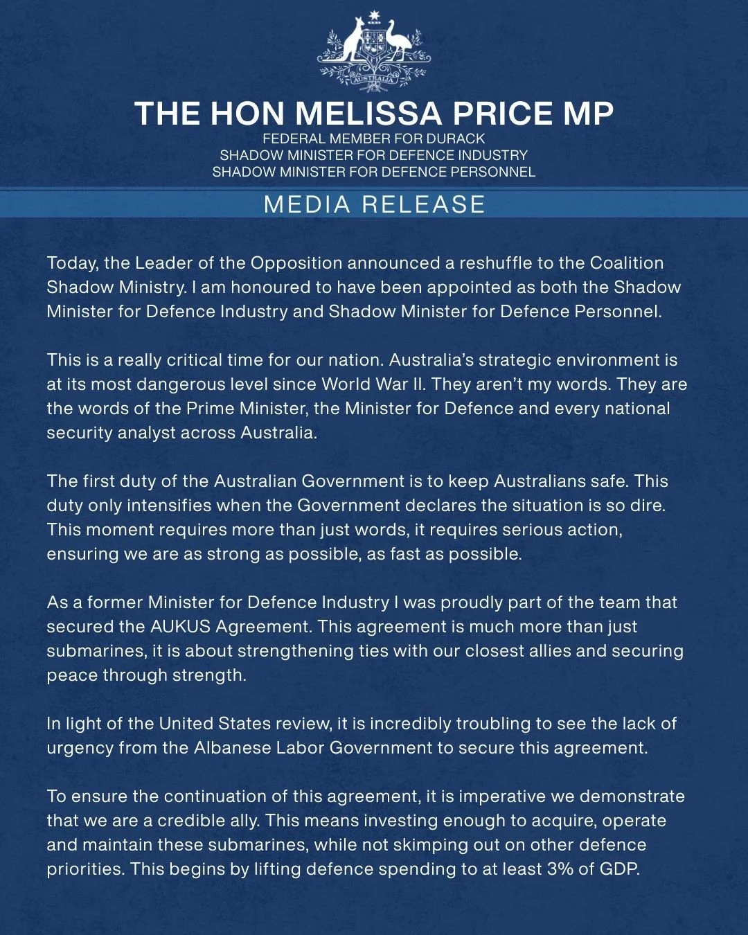 Media Release - Honoured to be appointed Shadow Minister for Defence Industry and Shadow Minister for Defence Personnel