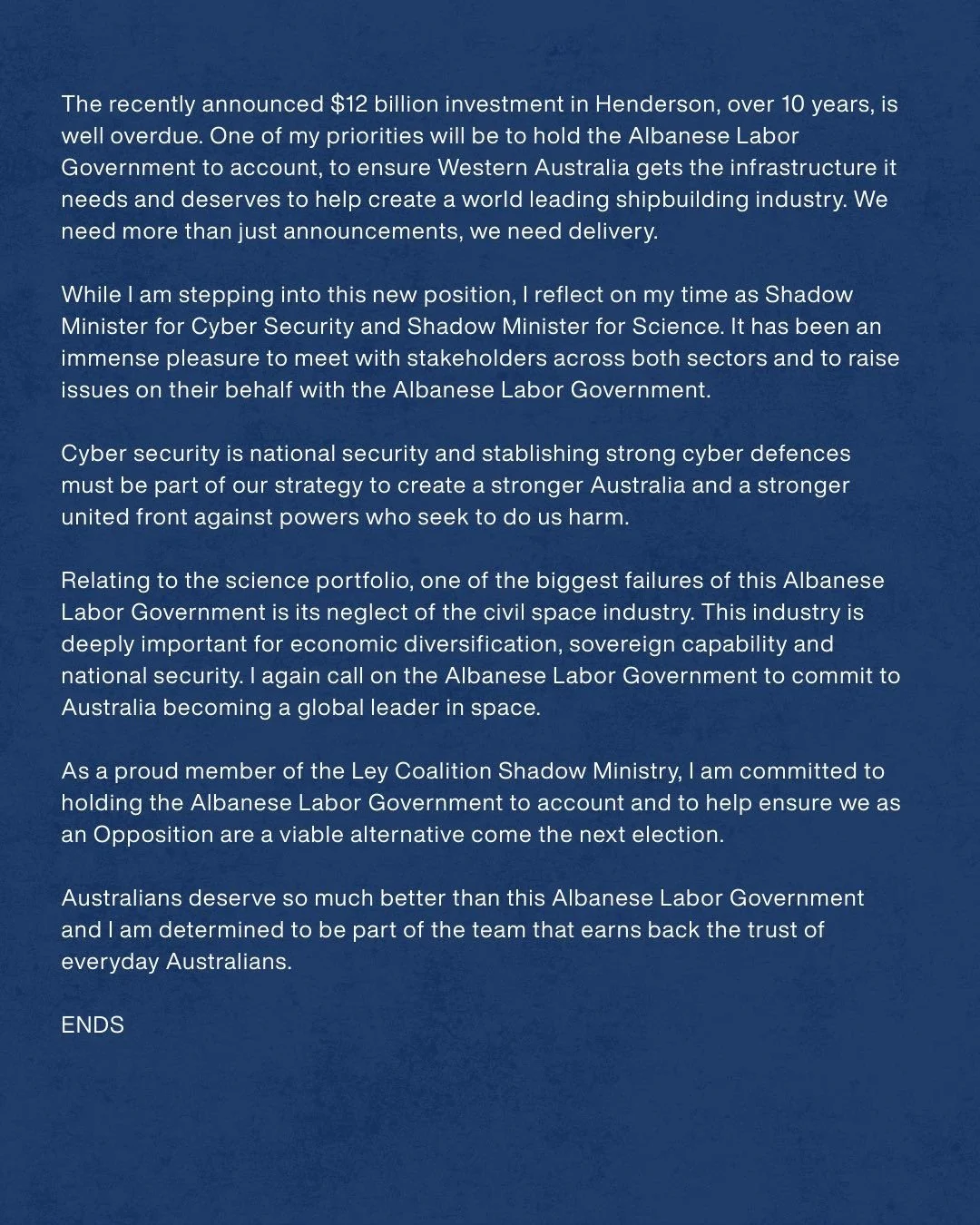 Labor keeps making big announcements but little progress. In this speech, I spoke about why the $12 billion promise for the Henderson Defence Precinct can’t just be another headline, it needs real funding, a clear plan, and urgency. Western Australia deserves to be at the centre of Australia’s shipbuilding future, and our nation needs to invest in defence readiness, not rhetoric. The Coalition will always back our Defence Force and our industry with action, not announcements.